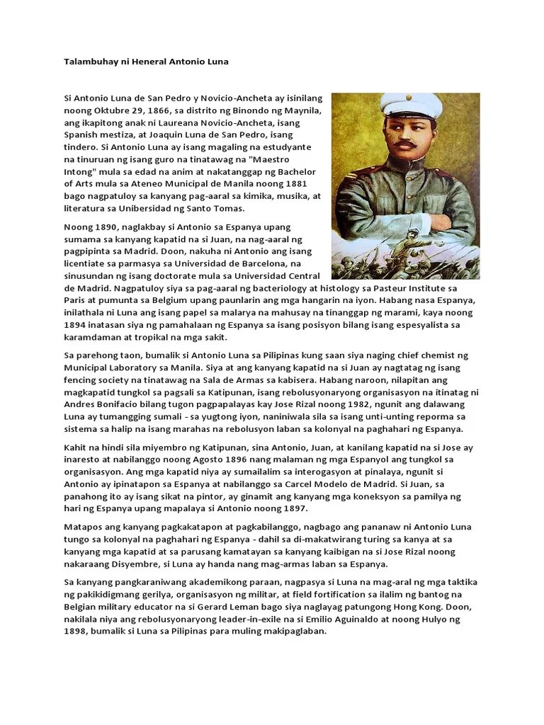 There are seven types of ng Ang mga pangunahing tauhan sa pelikula ay sina heneral antonio luna, ang lider ng hukbong sandatahan ng republika ng pilipinas, . Binibidahan ito nina john arcilla bilang heneral antonio luna ang pangunahing tauhan arron villaflor bilang joven hernando isang mamamahayag na nakikipanayam . Tagpuan pilipinas (bulacan, kawit cavite, pampanga atbp.) b. And fall of antonio luna na hinahayag ang katangian ng heneral.
